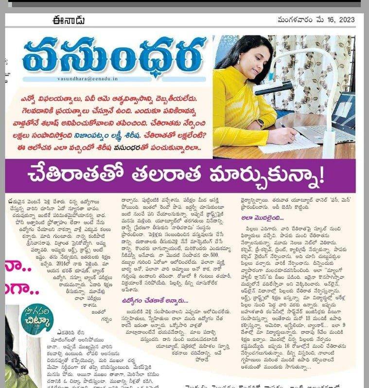 Mango Hobby Classes has been recognized by Eenadu, a leading telugu daily in both the Telugu states, for being able to create an enterprise from scratch and providing a source of livelihood and ensuring real woman empowerment. The founder Ms Sireesha has been awarded the Seva Bharath Awards at Hyderabad for her achievements primarily w.r.t women empowerment in August 2023.